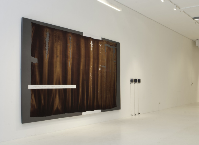 Al borde de ese lago paradisíaco que esconde otra tragedia vinculada con el terremoto del año 60 en Chile, saqué de la caja donde venían, una a una, las cuatro cortinas y las hundí —a excepción de la ya intervenida en Atenas — por Michail Theodosiadis atrapadas con piedras en el agua dulce que las golpeaba suave y acompasadamente. Quedaron ahí en remojo durante 3 días, para que soltaran, por decirlo así, las historias que traían entretramadas. En el transcurso de este proceso, que fue registrado en video, y al que quise otorgarle el carácter de un ritual, reparé en que cada una de estas cortinas tenía por detrás un forro, un “falso”, totalmente destruido por el paso del tiempo.