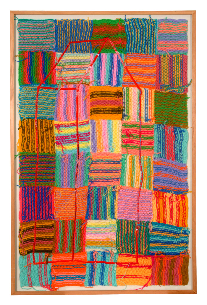 Obra de formato vertical, compuesta por cuadrados de lana tejidos a rayas de múltiples colores. El paño es de 9 x 5 cuadrados. Presenta el esquema de una casa bordado en color rojo. La obra está enmarcada con trasera blanca y moldura de madera natural.